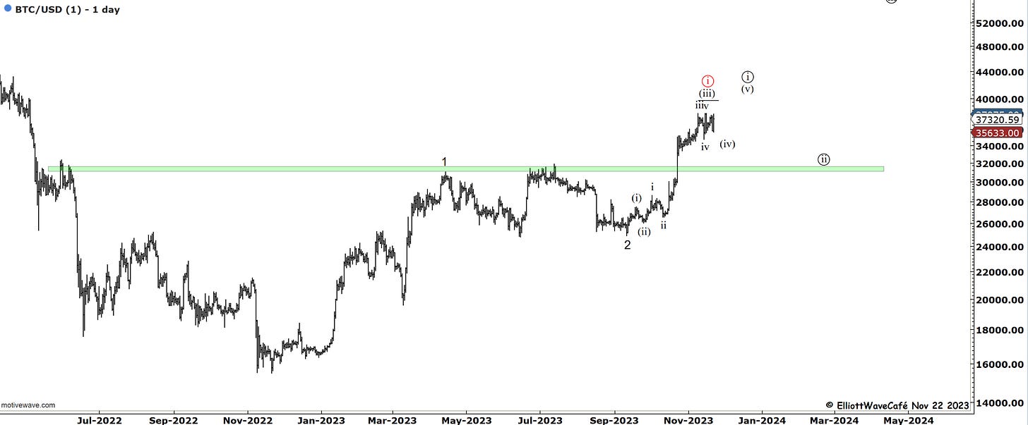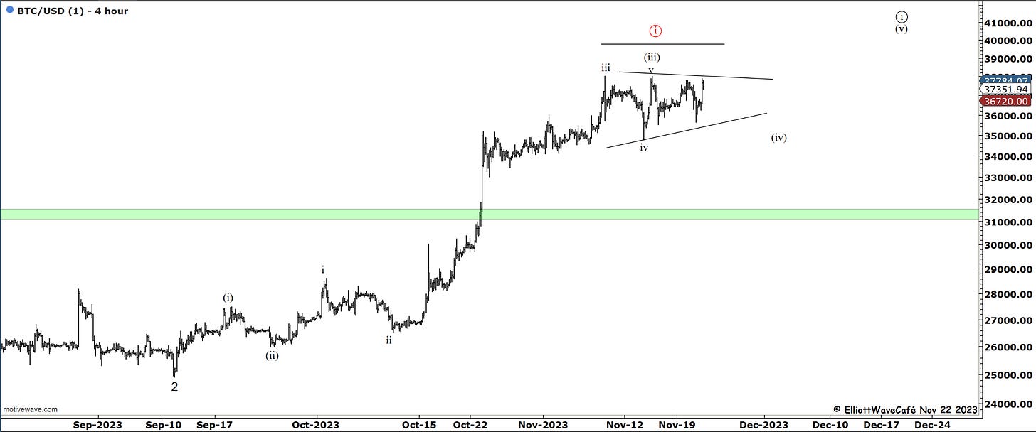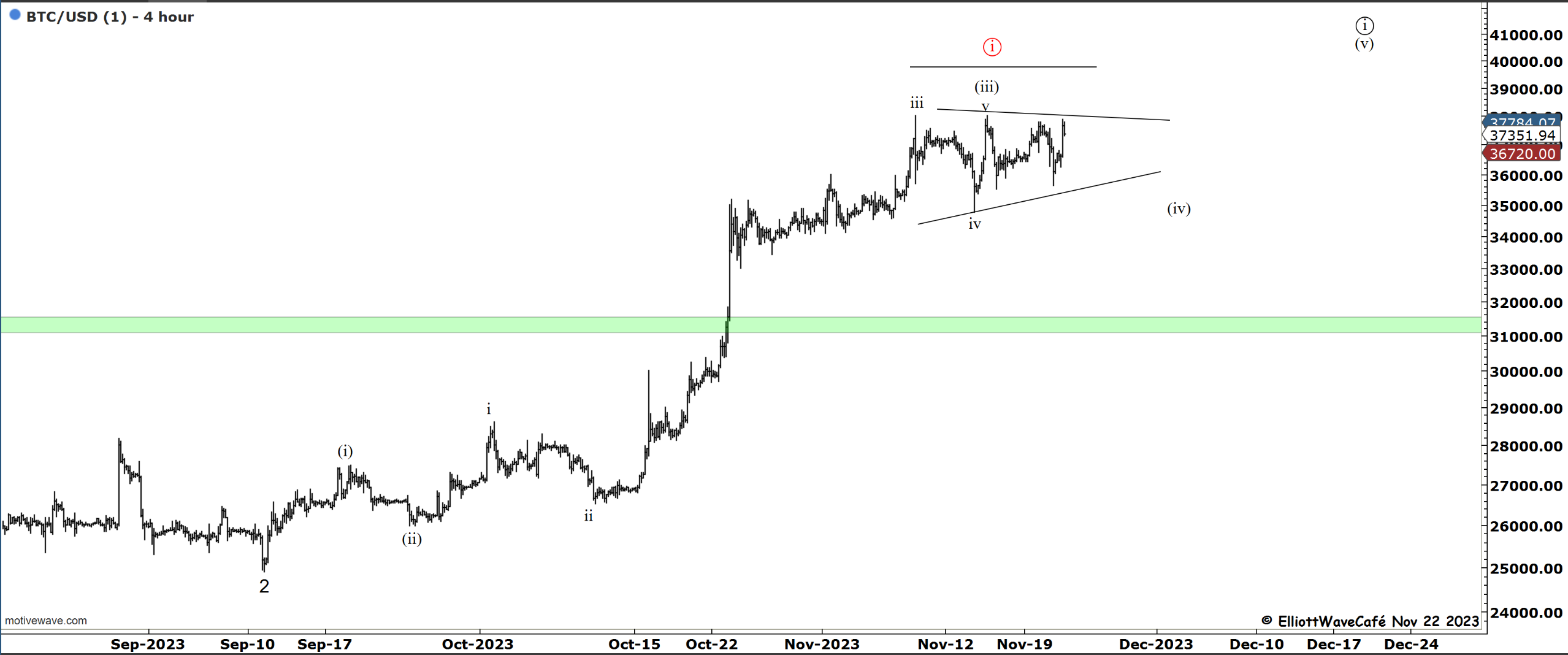 4th waves are tricky, so take a look at the price action since roughly Oct 23rd. A multitude of complex waves and triangles. The way it continues to build this sideways mess, suggests that we can still have one more thrust in wave (v) before we begin the corrective process once again. If we do escape higher without checking back towards 32k, then the crypto market has extreme underlying strength and it’s prone to explosive action. My bet is not on that at the moment. But I can be convinced.