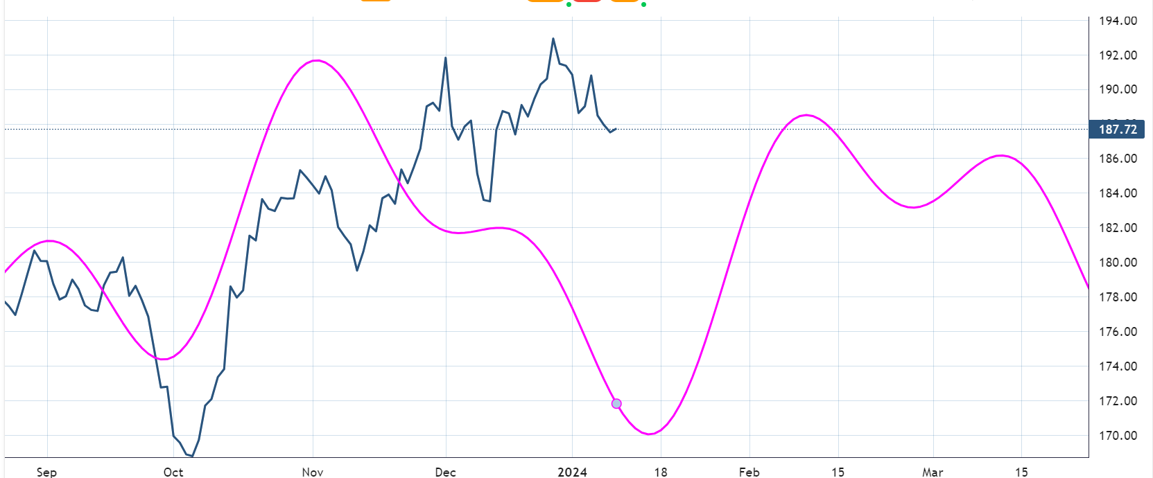 Even cycles are mixed at this daily time frame. Possible an upswing after January 20th. GLD below.