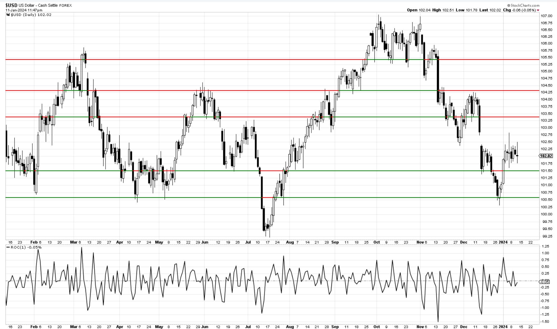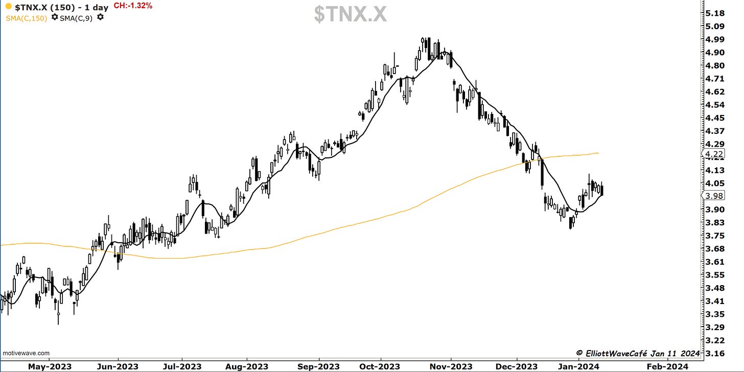 Both dollar and yields rallied quickly in the CPI news but then fell back into their ranges. The gains were not sustained. Nothing has changed the larger picture, however. The dollar has found a low at the end of December, and it is now on an upswing. We discussed cycles in prior issues.