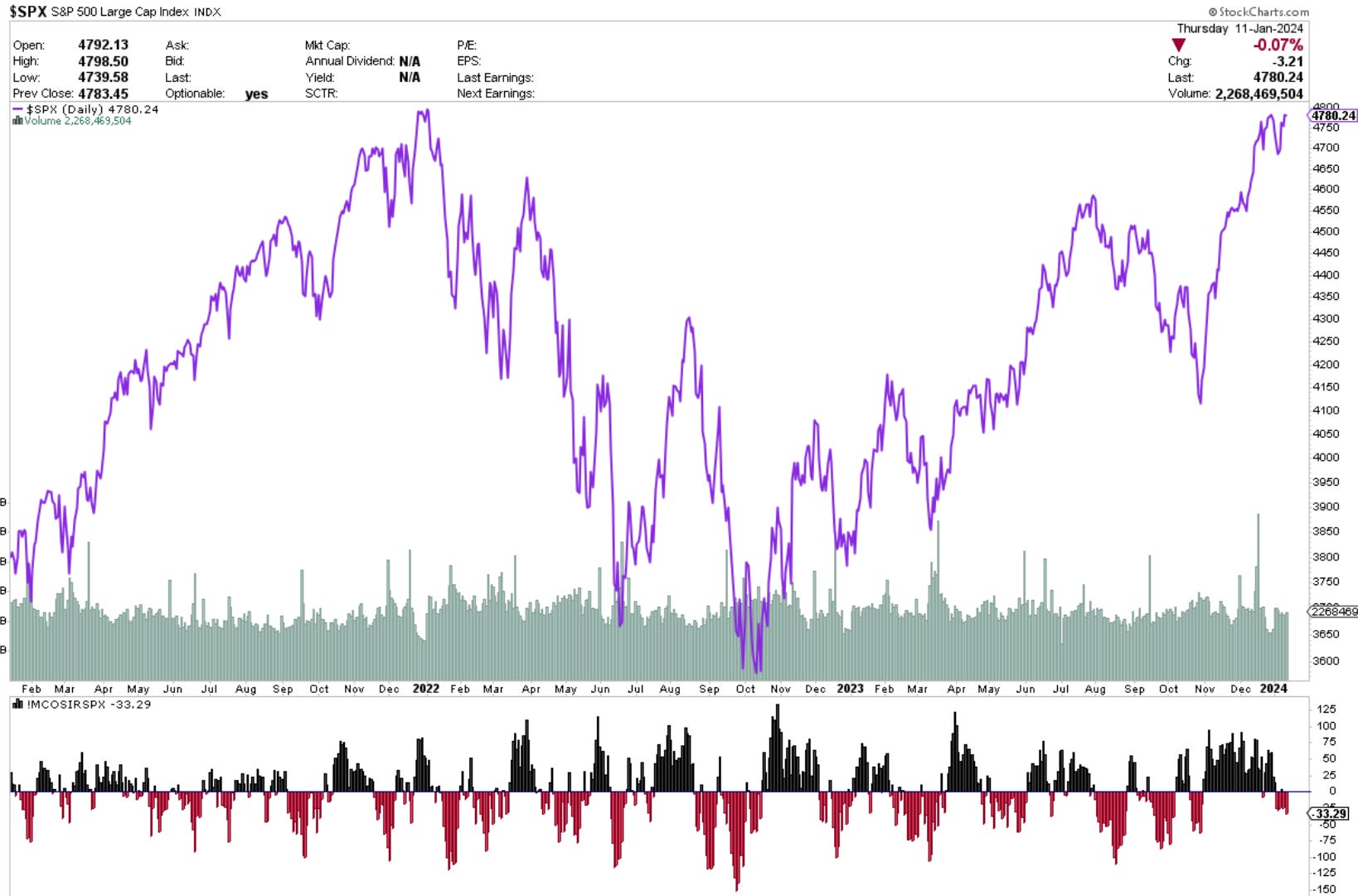 (Developed by Sherman and Marian McClellan, the McClellan Oscillator is a breadth indicator derived from Net Advances, which is the number of advancing issues less the number of declining issues. Subtracting the 39-day exponential moving average of Net Advances from the 19-day exponential moving average of Net Advances forms the oscillator.) You can see how negative we are with prices trying to make new highs.