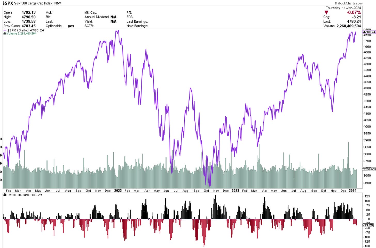 This is the McClellan Oscillator. You can see how negative we are with prices trying to make new highs. The declining issues are dropping much faster than the advancing are rising.