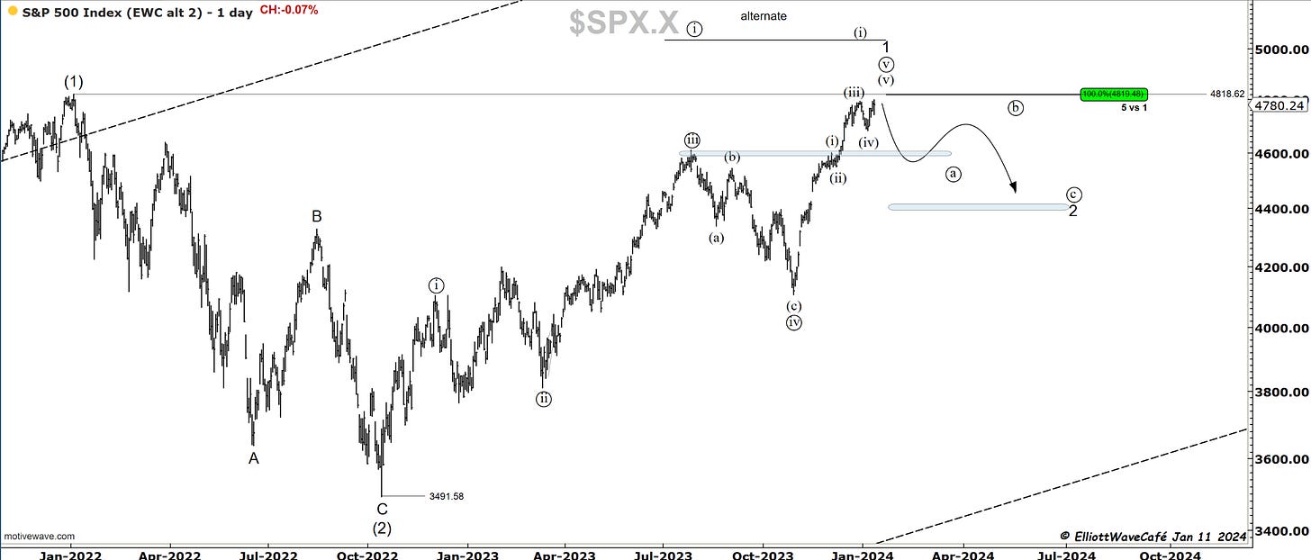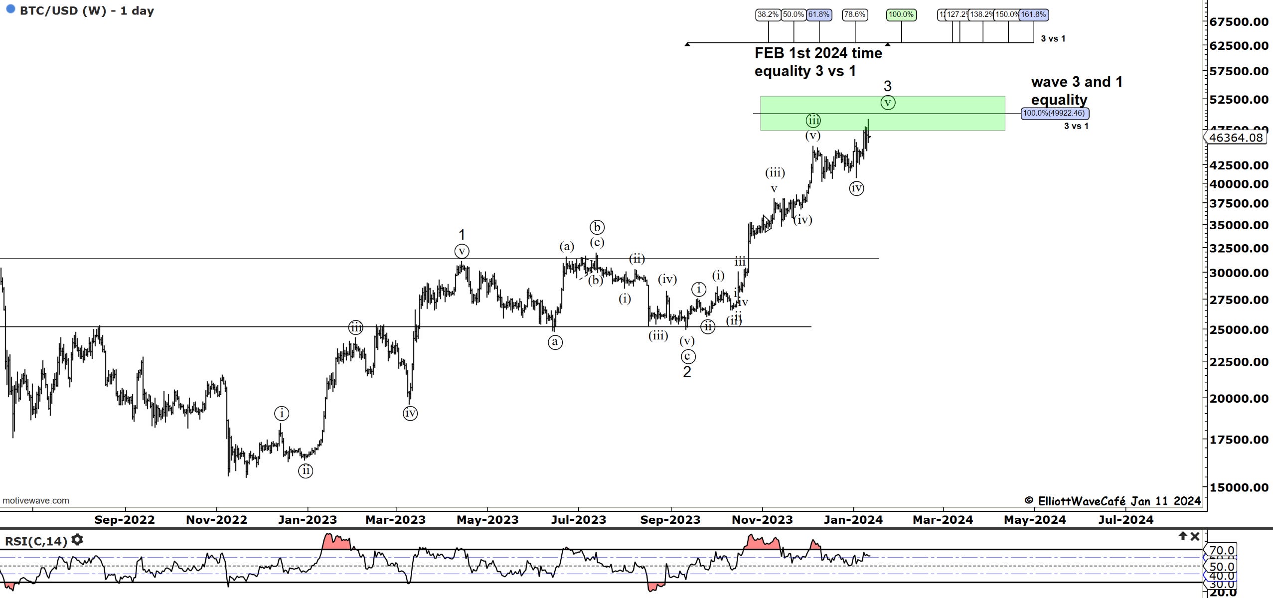 Today was the first day of trading for roughly 10 Bitcoin ETFs. While the flows were positive and impressive for the first day, the price has not done a whole lot. There was a quick rally close to 49k followed by a decent pullback of 3k lower. Both weekly and daily charts have not yet provided enough evidence that this uptrend has been violated in any way. My count remains the primary view as we’re very near equality between waves, both in time and in price. If there is a “hangover” after the ETF release party, prices should start to break 43k over the next several sessions. It’s been volatile and choppy since the end of December. This market is now fully institutionalized, and that comes with positives and also negatives. Don’t put anything behind Wall Street’s ability to engage and distort this market. Options on those ETFs will be just the beginning. Then leveraged ones.