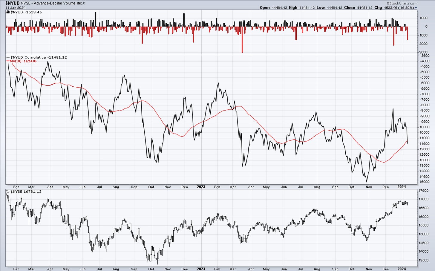 We’re looking below at the NYSE and the volume of declines vs the advances. The upper panel shows the daily swings, while the main chart shows the cumulative volume. Dropping sharply with almost no upside volume existing.