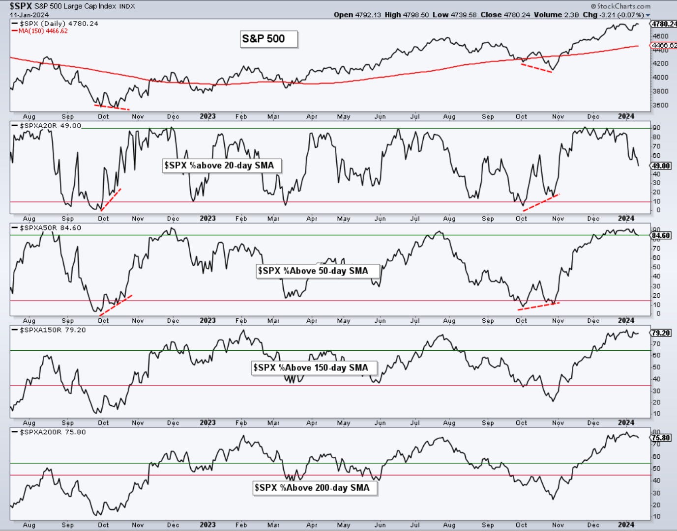 This is a basic breadth based on prices above different moving averages. While the longer-term ones seem to be still intact, notice how the 50-day is starting to tilt lower, while the 20-day has been declining for a while. About 50% of stocks in the SP500 are now below their 20-day MA.
