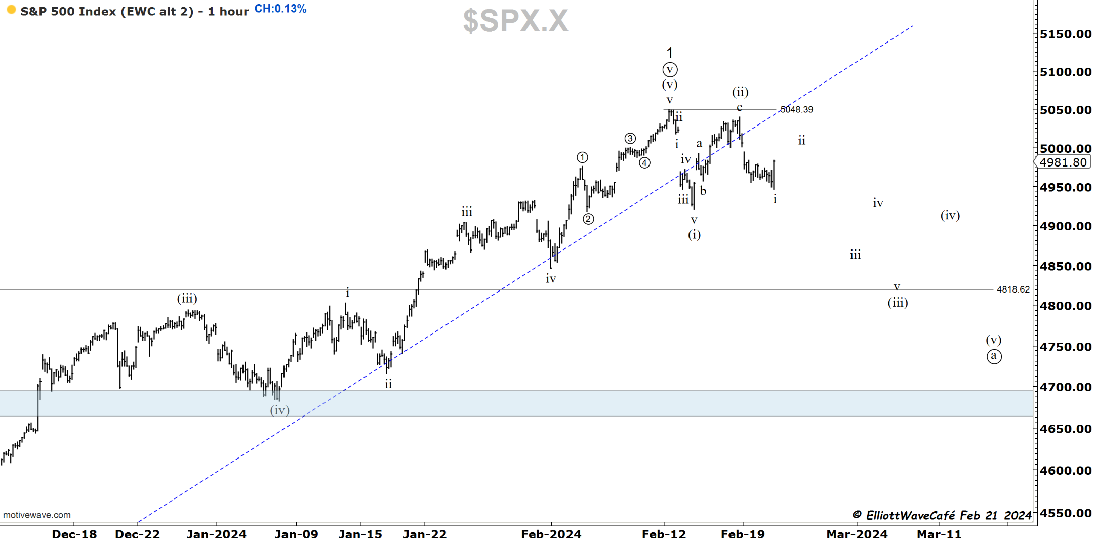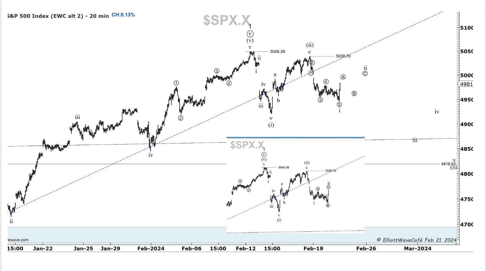 Ther indices spent most of the day on a weak note and making new lows, only to show some buying in the last 30 min of the day, creating a positive close. This is a positive sign for the bulls in the short term, but it does not change the count structure I am following. The rally is either wave ((c )) of wave ii ( flat) or wave ((a)) of ii. This depends on where we place the bottom of wave i. The high at 5038 is the invalidation level.