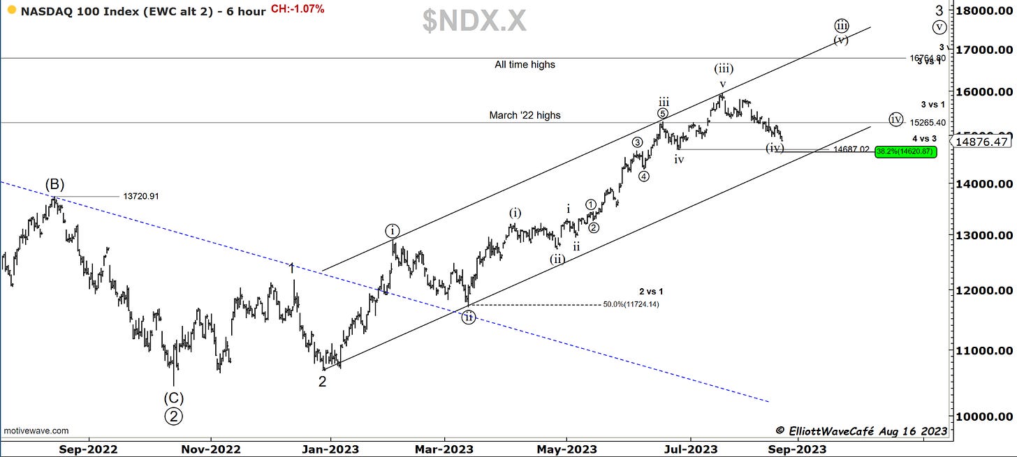 After the rejection from 15,265 the index made a new low and is now approaching the next area of heavy demand near 14,687. This previous wave iv low coincides with 38.2% retracement of wave (iii) just like int the SP500. I think we hold there and start to turn upwards once again.