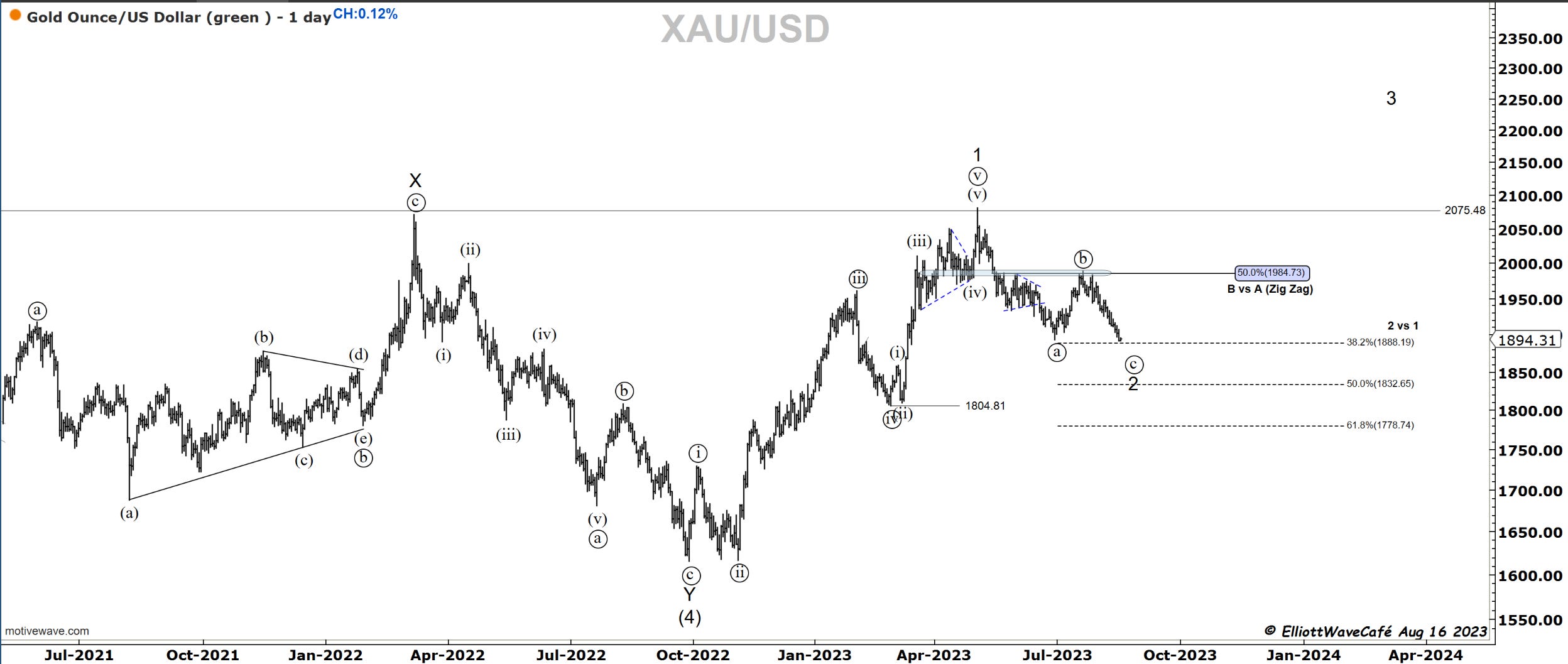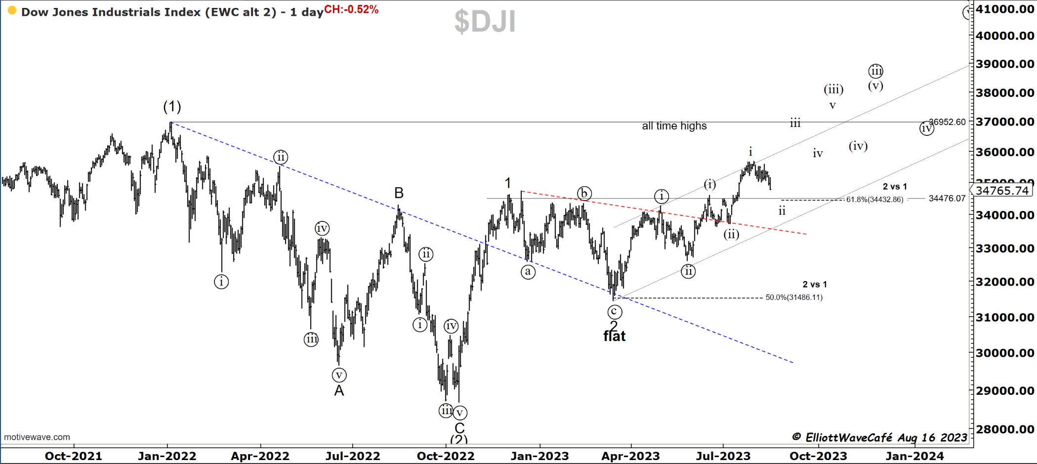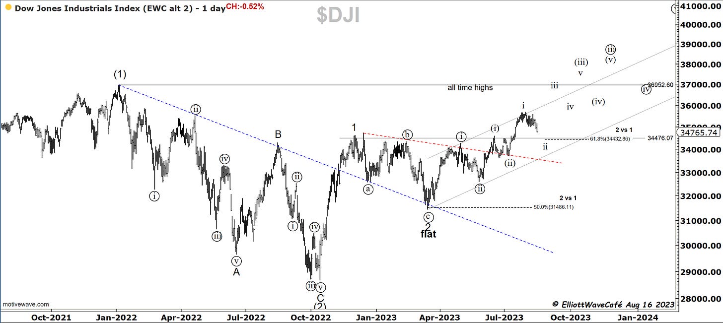 Dow Jones is getting near the previous breakout zone of 34,500, where if you notice on the chart, we have 61.8% levels for wave ii. So far, we have looked at three charts all pointing to important fib levels in their respective corrections. I think the market holds there and bounces.