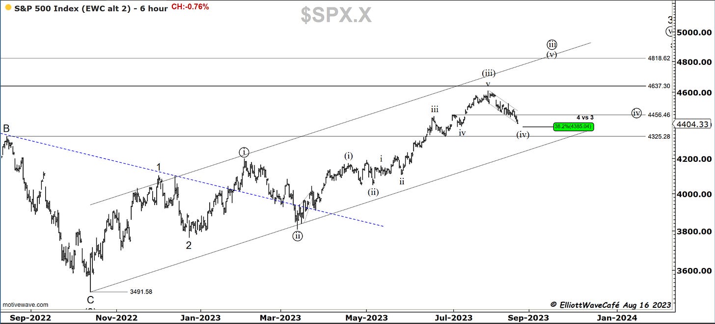 If my wave count is correct, we will reach 38.2% retracement of wave (iii) at 4385. The correction remains within normal parameters even tho it feels heavy as things unfold in real-time. We have strong additional support at 4325 if the selloff continues. I want to remind you this is a monthly option expiration week which tends to be usually heavy on volatility. There was a lot of premium built into these options over the course of the rally. I think it’s got something to do with it. Once a 4th wave low is established, we should begin the next advance towards 4600 and above.