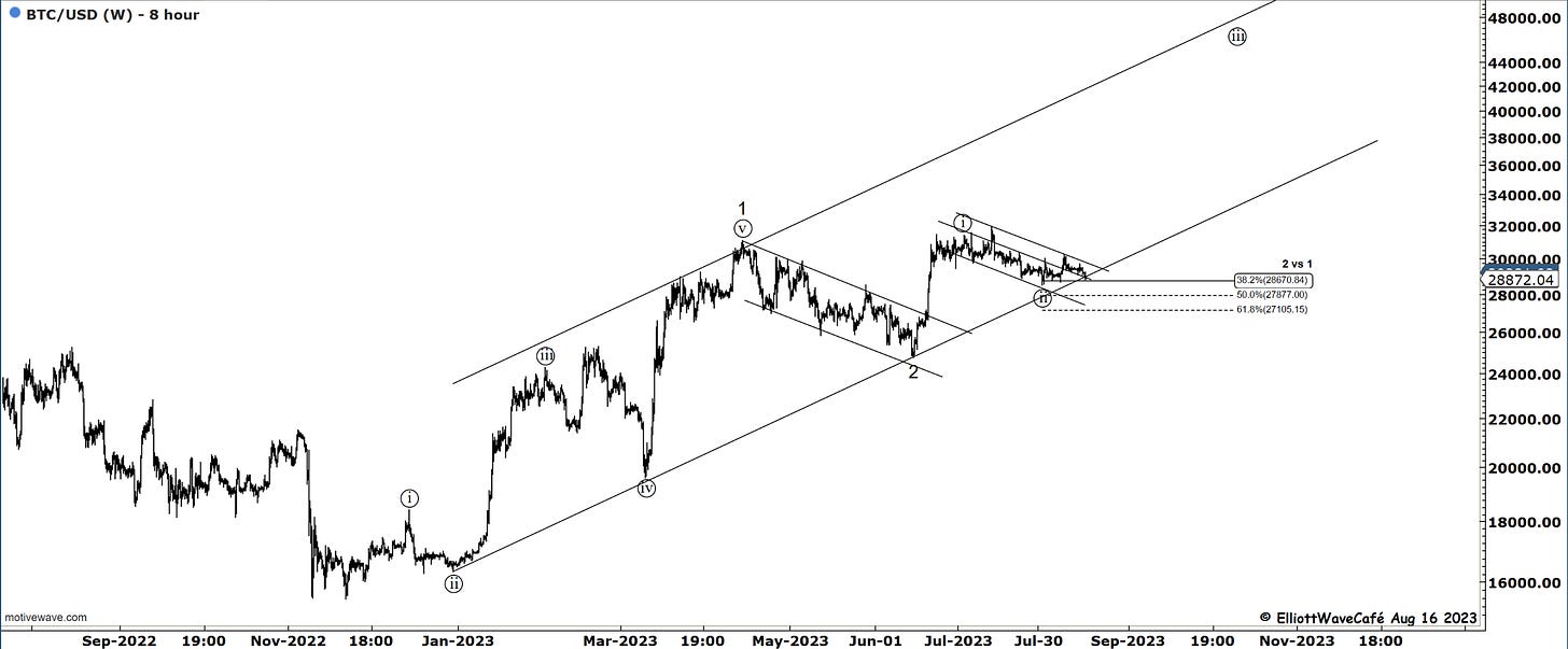 Any rally attempts in BTC continue to fail, pushing the corrective structure further to the right. If we break lower, we have 27105 at 61.8% as a fighting zone and anything below that could unleash a lot more selling. Bitcoin and ETH movement has been minimal since April. One of these days, the space will explode in volatility once again. One thing that worries me about this count, is that a 1,2 ((i)), ((ii)) should not behave like this. I think we’re getting very close to a resolution here.