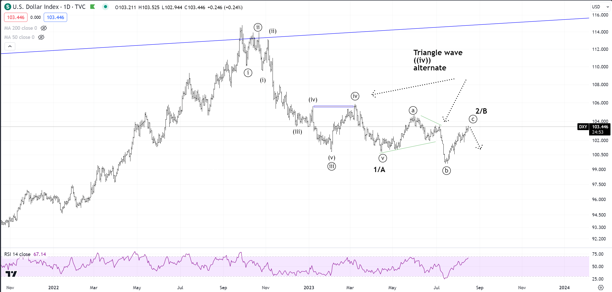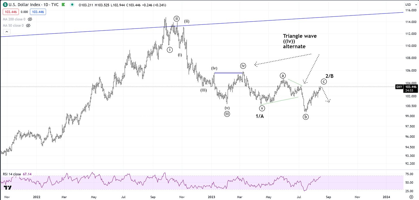 The dollar is the fly in the ointment. The moment is made the low in mid-July, the risk assets have started to correct. We’re starting to hit some heavy resistance zones here, so a pullback should be imminent. The larger question looms, is this wave ((c )) of a flat or just wave ((a)) of a larger wave 2/B. ( when one considers latest low as wave ((v)) of 1/A). If we’re correct in calling the equity risk correction complete, then the dollar should have headwinds here.