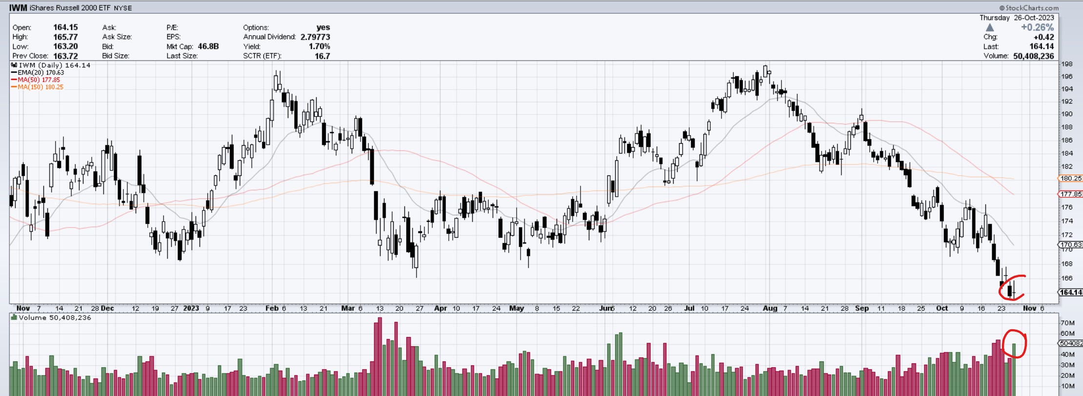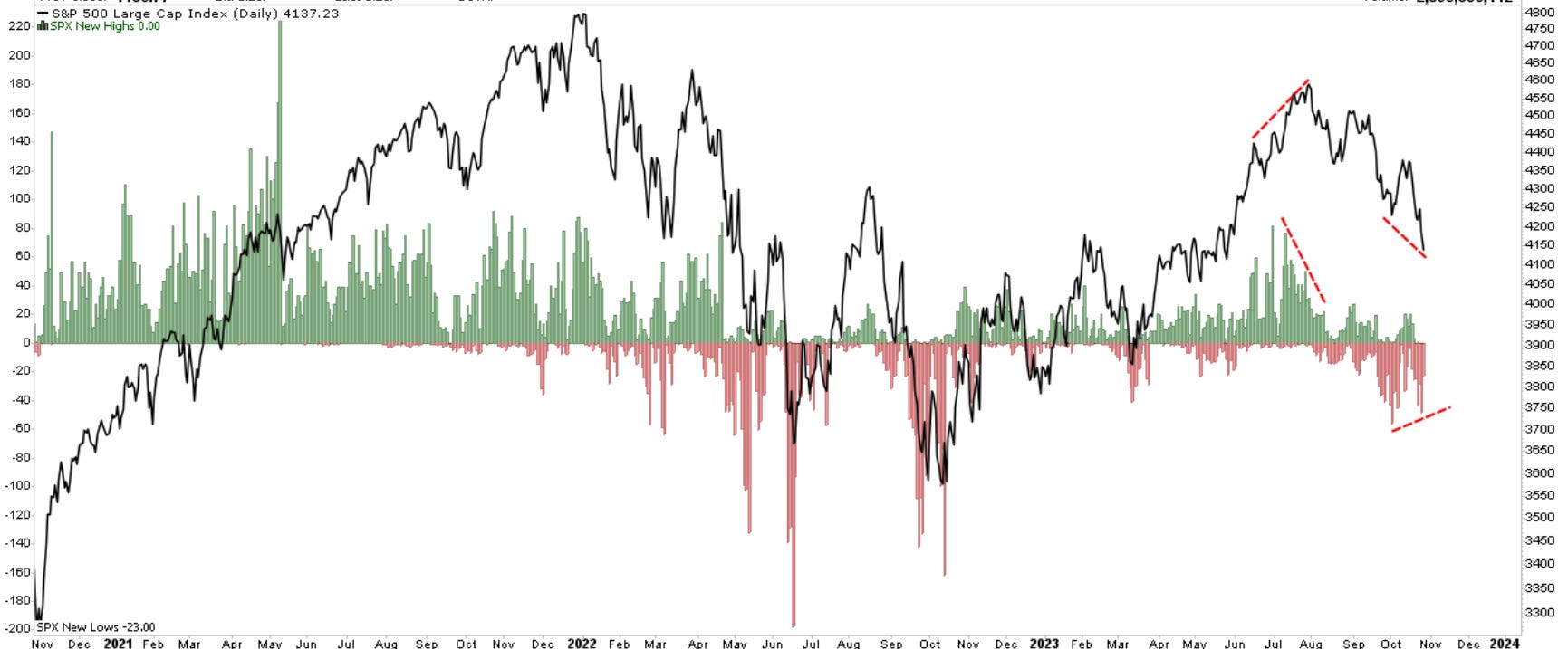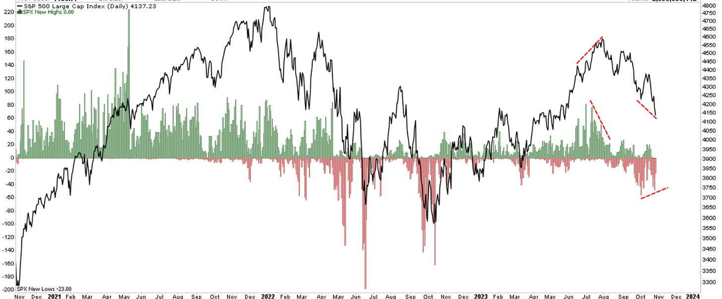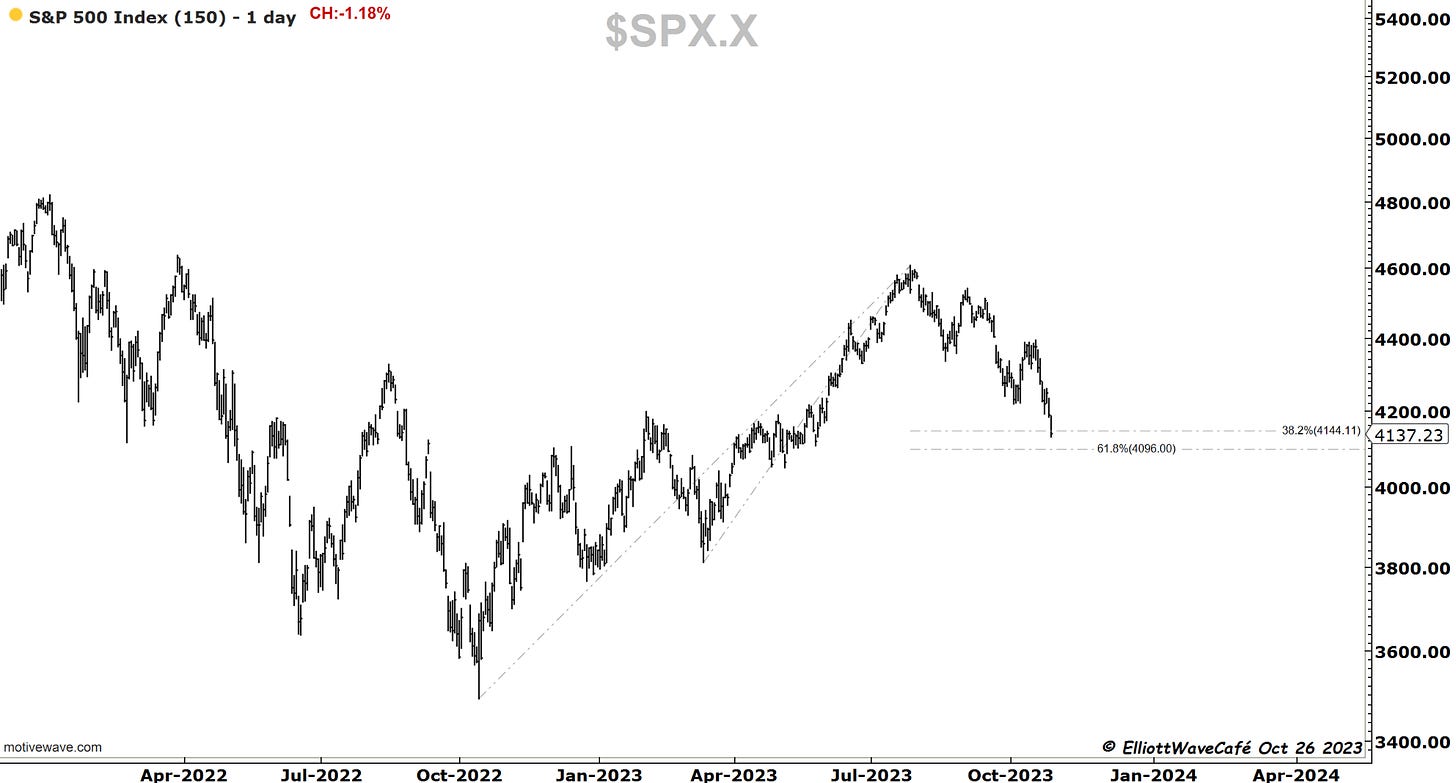 The decline today felt severe, especially with the overnight futures breaking down. There was a slight recovery intraday, but then the large caps got hit, and it created new lows in major indexes. We have lost the 4185 and closed at 4137.23. The prospects of the entire decline from July top becoming a 1,2 1,2 and actually being in a 3rd of a 3rd are understandable, but I want to caution against that view for the time being. There is underlying evidence of breadth divergence, seasonality, rates peaking, dollar stalling, and even appetite for crypto risk. While there is more price evidence needed to establish a better call for a stronger low, I think the bulk of the selling is in the final stages, and the window for price recovery is getting wider.