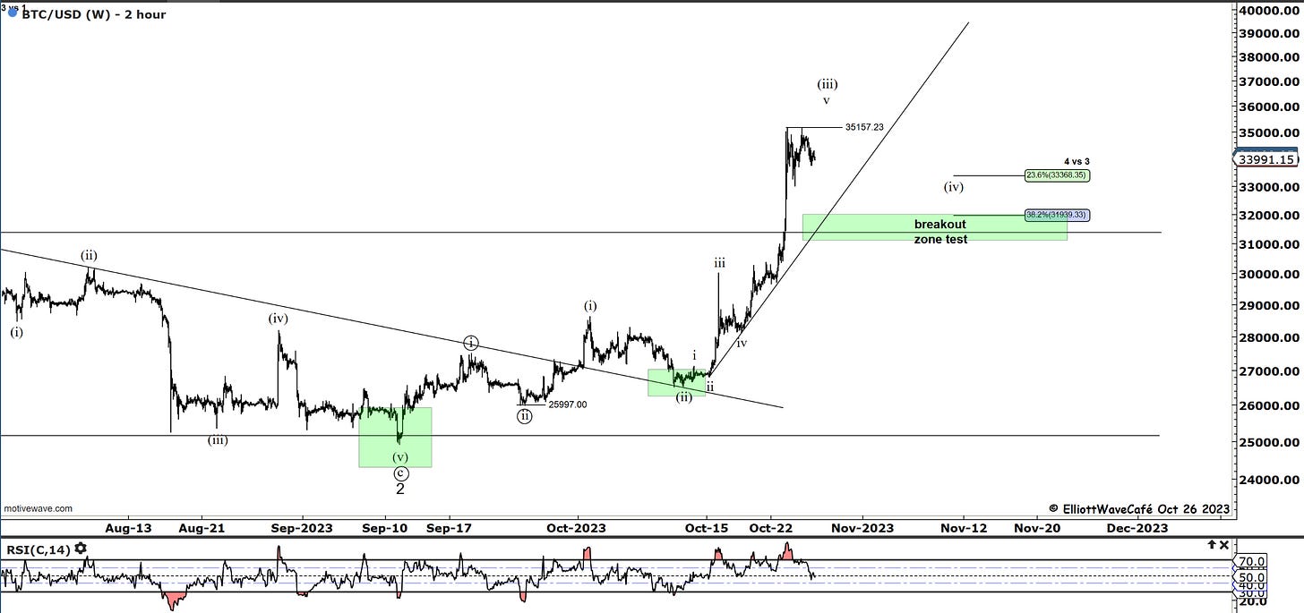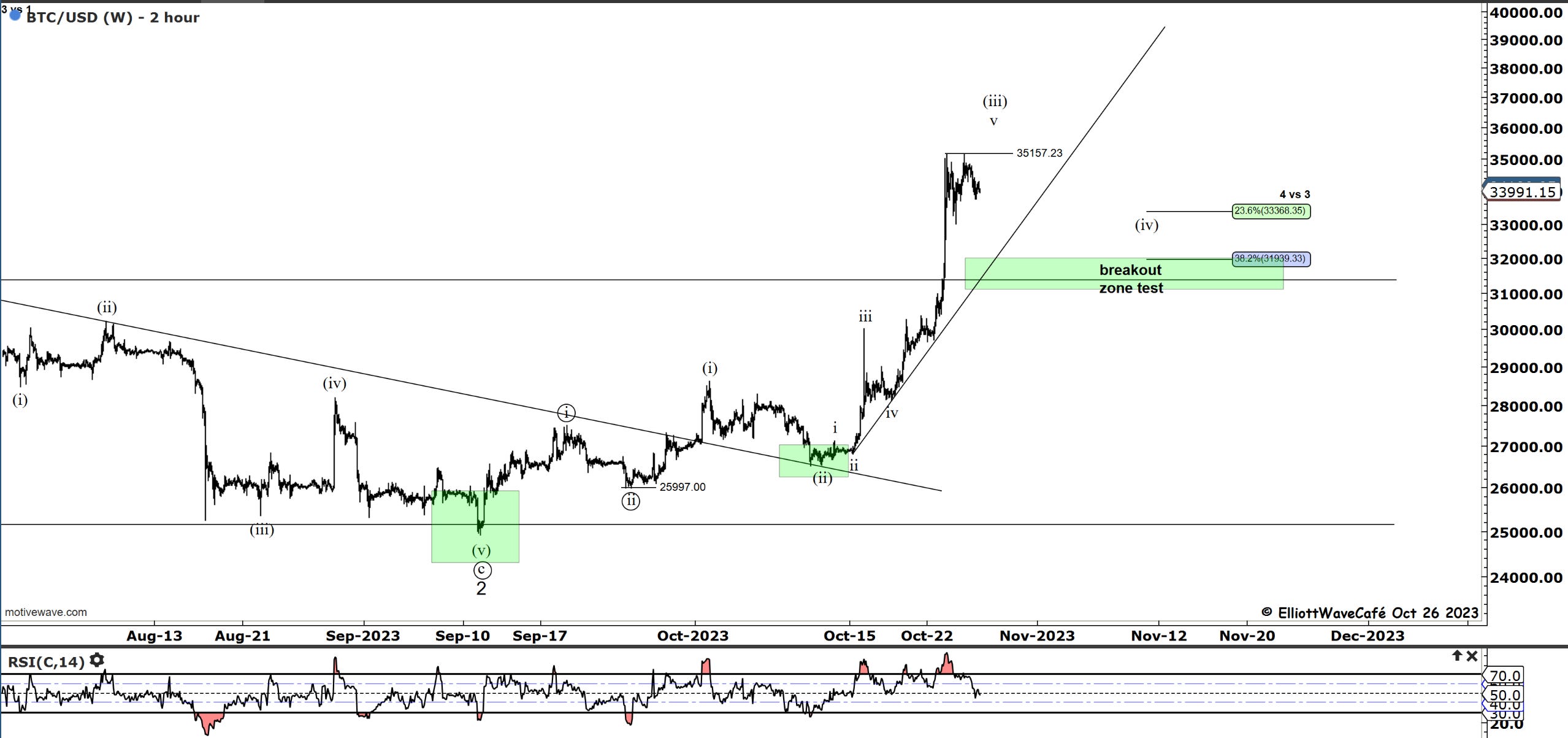 Depending on where wave (iii) actually terminates, we should have a 23 to 38.2% pullback. That puts us at the 32-33k zone initially. It should give way to the next opportunity for trading a wave (v) advance.