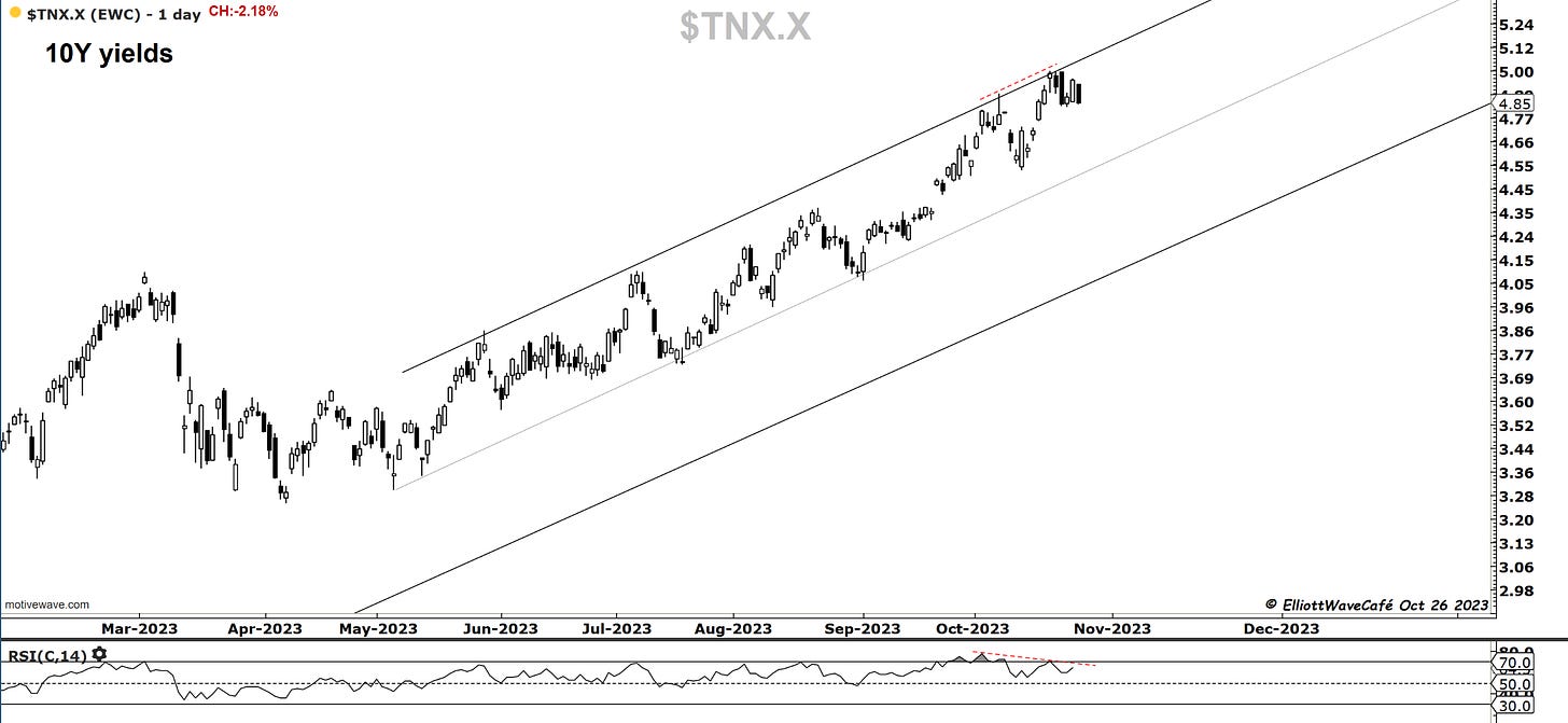 Yields have been pulling in some more and that is helpful for risk assets. Price will probably target the lower channel boundaries. Momentum is on the decline.