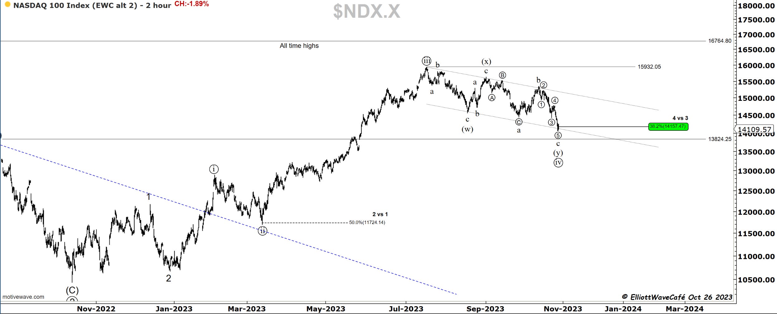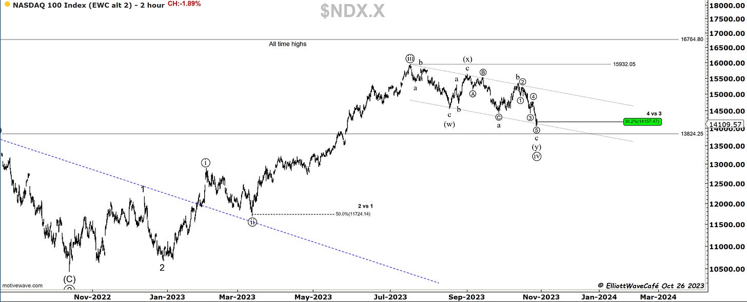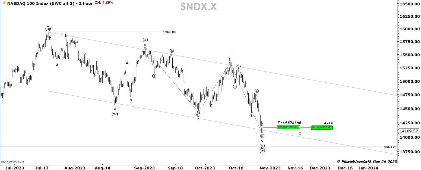 The Nasdaq correction is becoming clearer. We seem to be in double three formation, where the first (w) was a zigzag followed by a flat in wave (y). We have also hit the 38.2% for a standard wave ((iv)) throwback. The Aug ‘22 highs are also just slightly below. Notice on the second chart the 100% equality of c vs a .