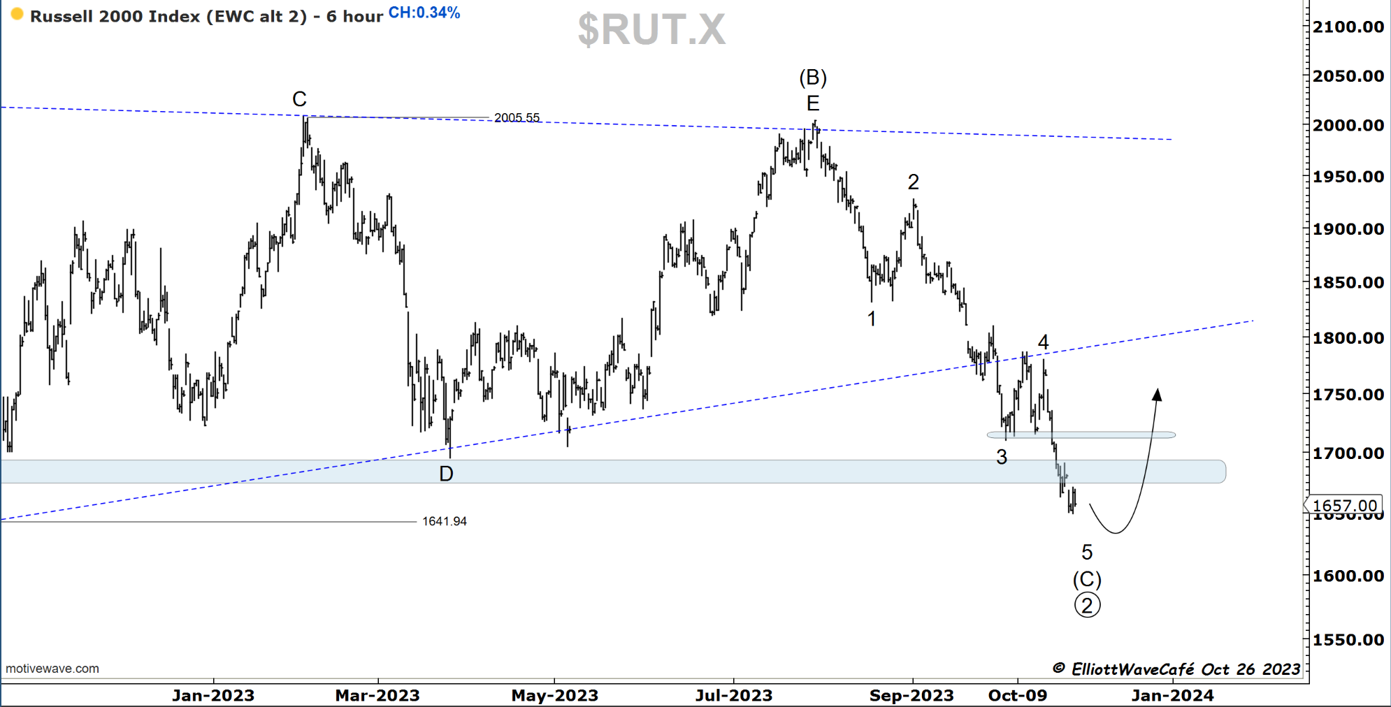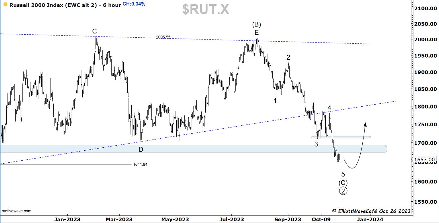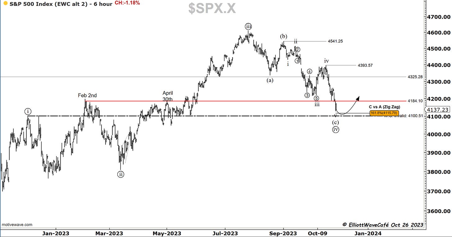 The Nasdaq correction is becoming clearer. We seem to be in double three formation, where the first (w) was a zigzag followed by a flat in wave (y). We have also hit the 38.2% for a standard wave ((iv)) throwback. The Aug ‘22 highs are also just slightly below. Notice on the second chart the 100% equality of c vs a .