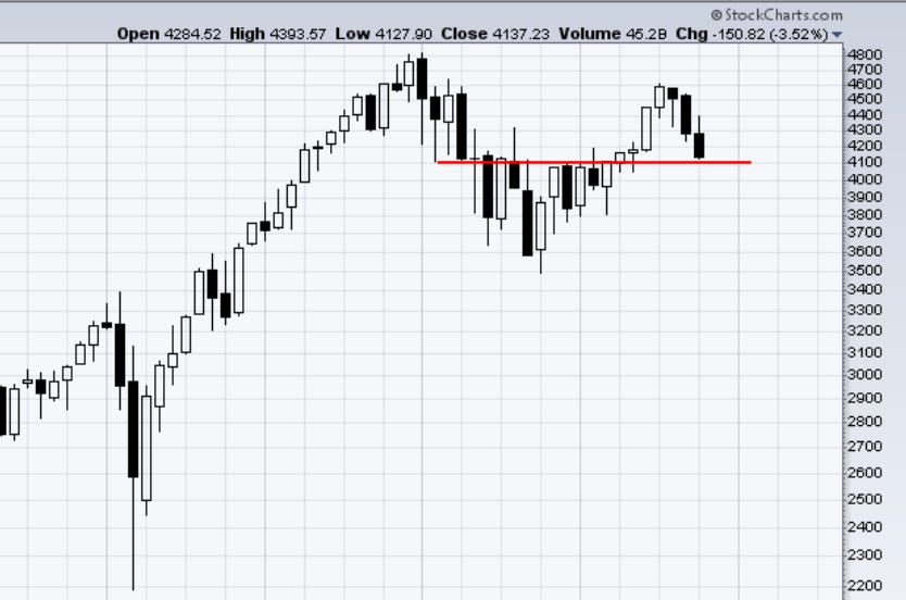 Here is the monthly chart of the Sp500 and the bulk of candles near the 4100 level. With 3 trading days left in this month, I would keep a close eye on this one. For those investing longer term, the risk-reward here seems quite appealing if this is just a re-test of the breakout zone from earlier this year.