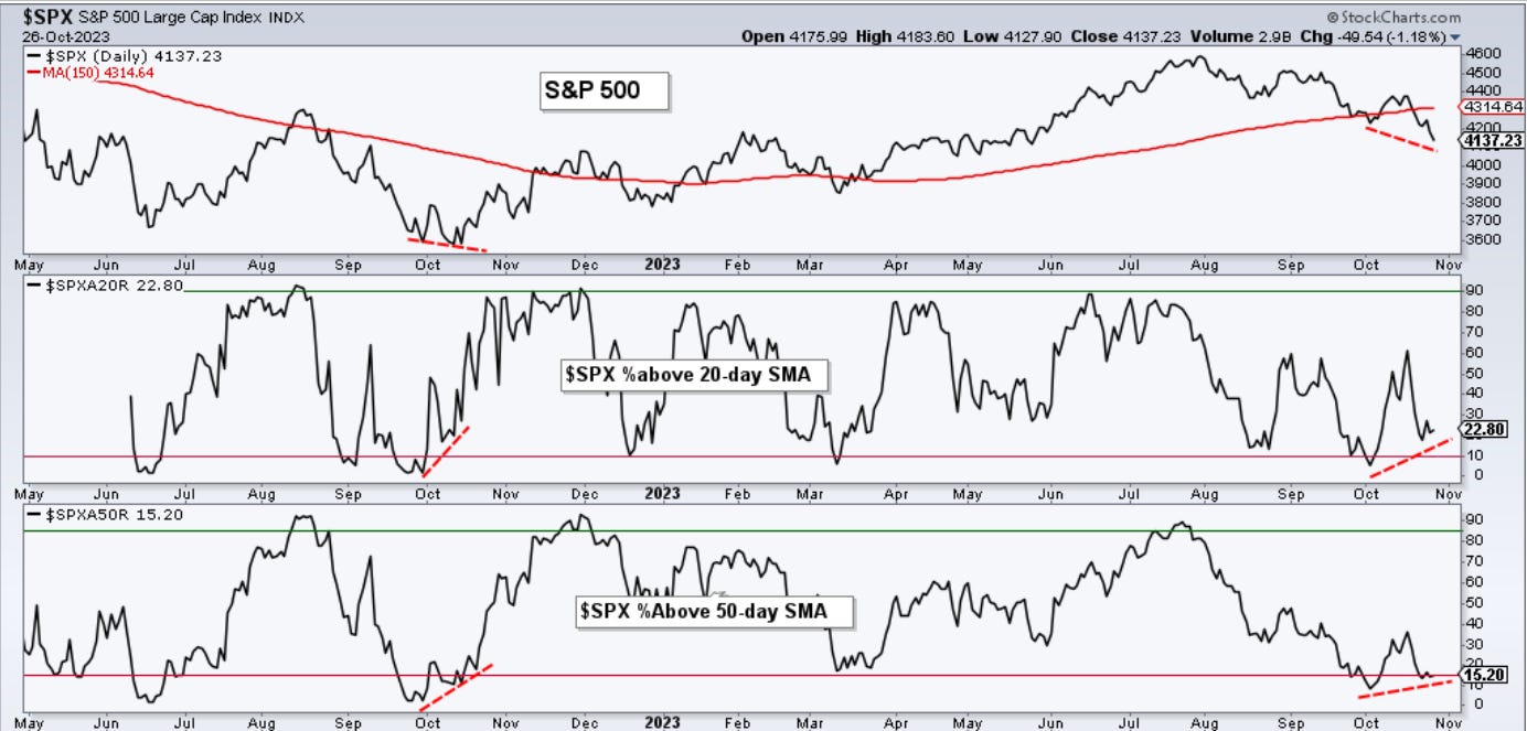 Here are stocks above 20 and 50day in the Sp500 holding strong on a tape that’s making new lows. The last time we had this type of development was a year ago before we started rallying and formed the low.