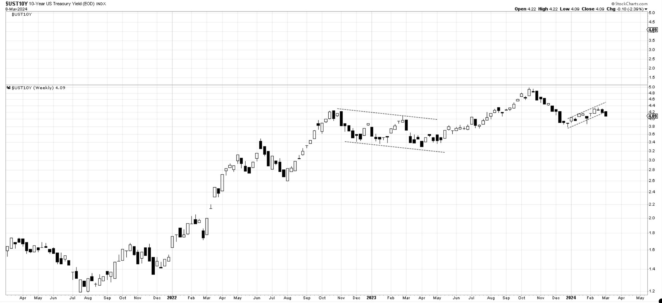 10y Yields - this small weekly bearish flag in yields is a must-watch. If we lose 4% is quite likely we will make new lows. The implications for markets are debatable depending on speed, but lower yields will help risk assets, especially small caps which depend on borrowing.