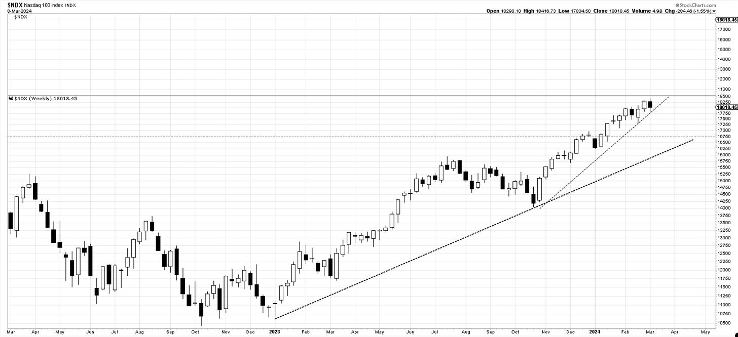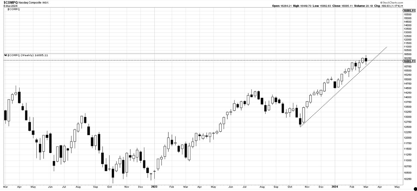 Nasdaq composite: The Nasdaq composite failed to continue closing higher after the bullish close last week. This is not a major signal, but “caution warranted.”
