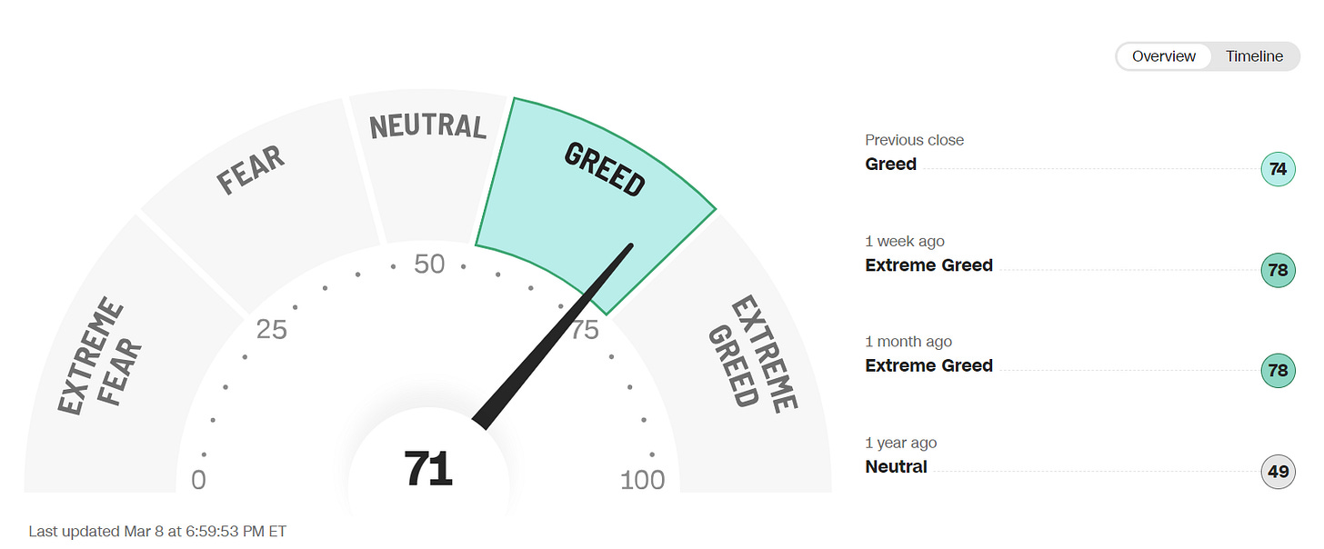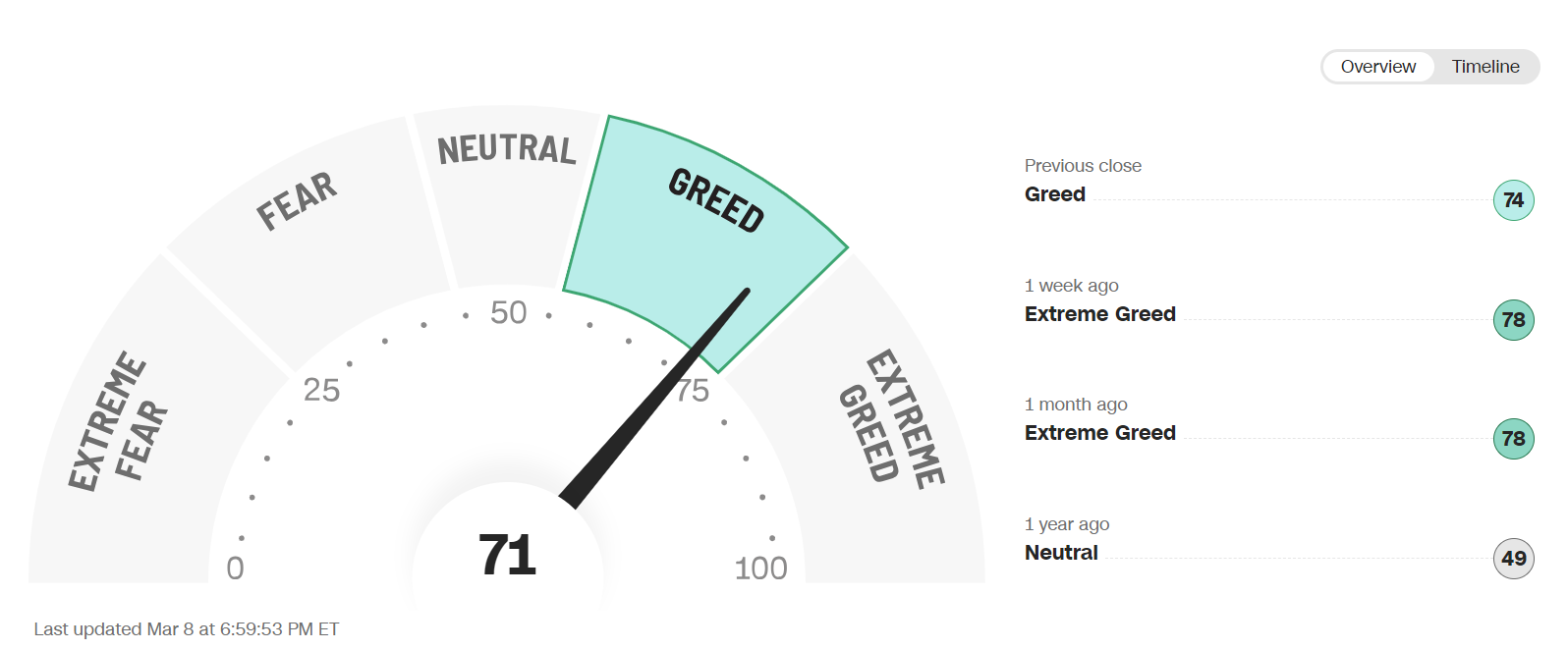 The sentiment section would not be complete without the CNN gauge of Fear vs Greed. We droped into a lower greed sector this week as markets cooled off a bit. My read here is that traders are growing cautios.
