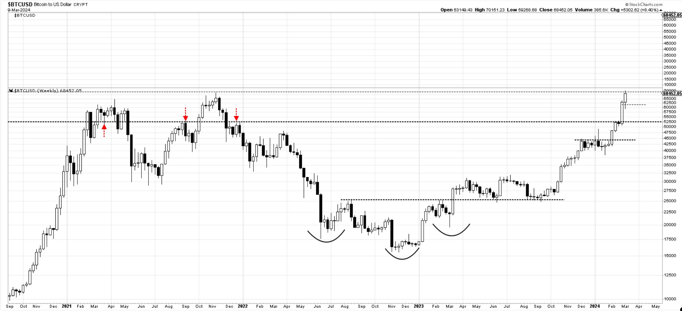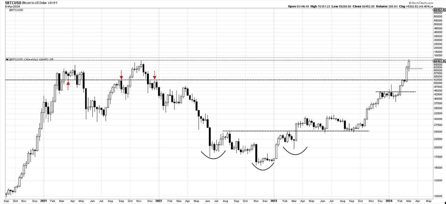 Bitcoin - it seems likely that we will be closing at new all-time highs this week. The price action here on the weekly charts remains bullish. I discuss this on a daily basis through written and video updates via “The Daily Drip” updates. Support is near 61k. Dips are likely to continue getting bought into that level.