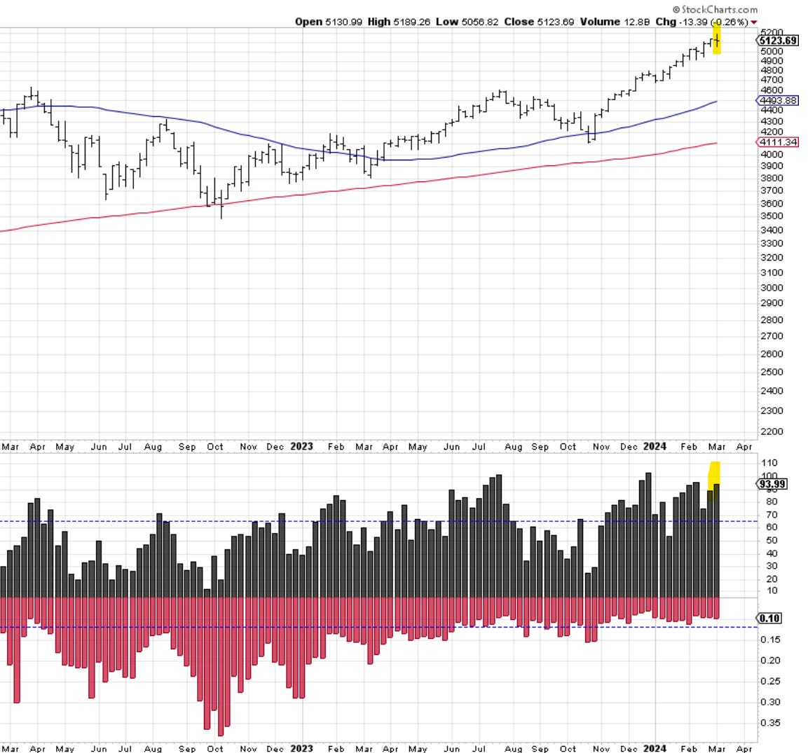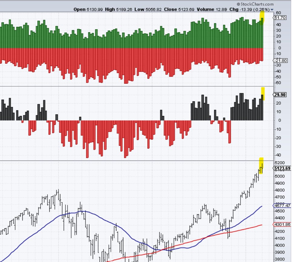 The spike in the bull-bear spread this week is somewhat concerning and is trying to signal a nearby top approaching. It’s at the highest levels since December of last year.
