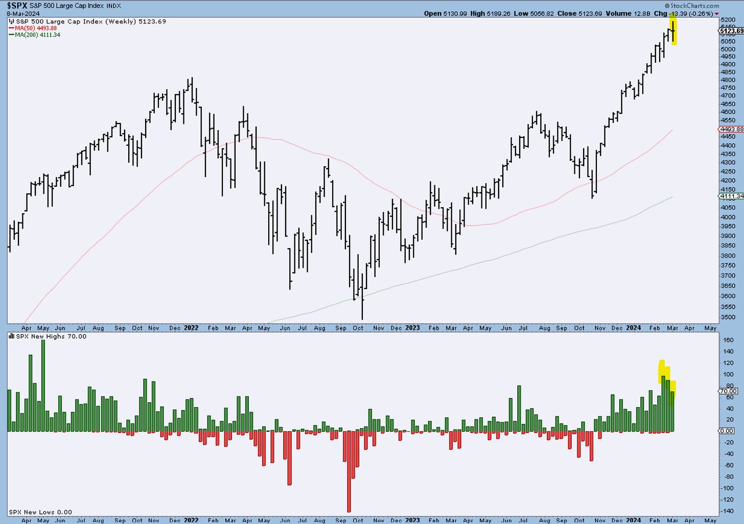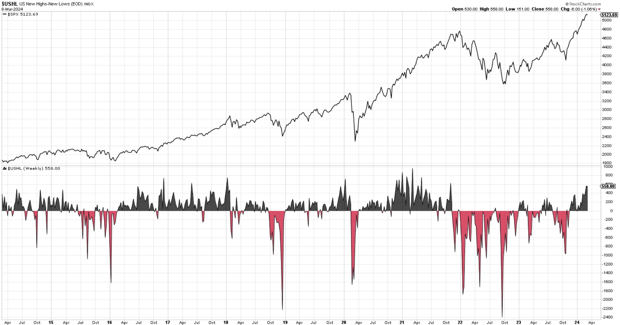 Here is the total new US highs vs. new lows. Black is good, red is bad. 564 new highs last week and 558 this week.