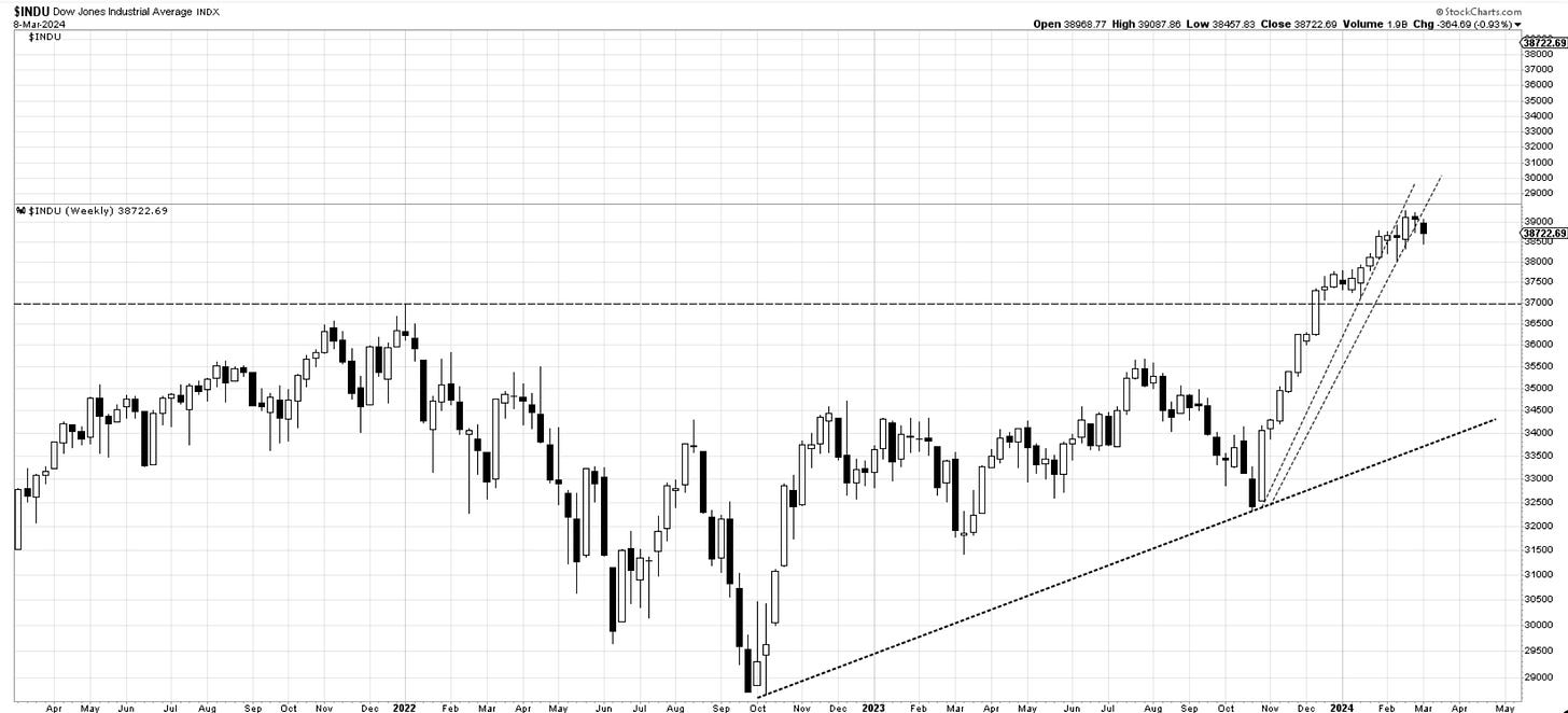 The Dow Jones 30 index has shown persistent weakness for the past two weeks. This week’s close doesn't inspire confidence. If a corrective move is starting, it will likely get us to 37000.