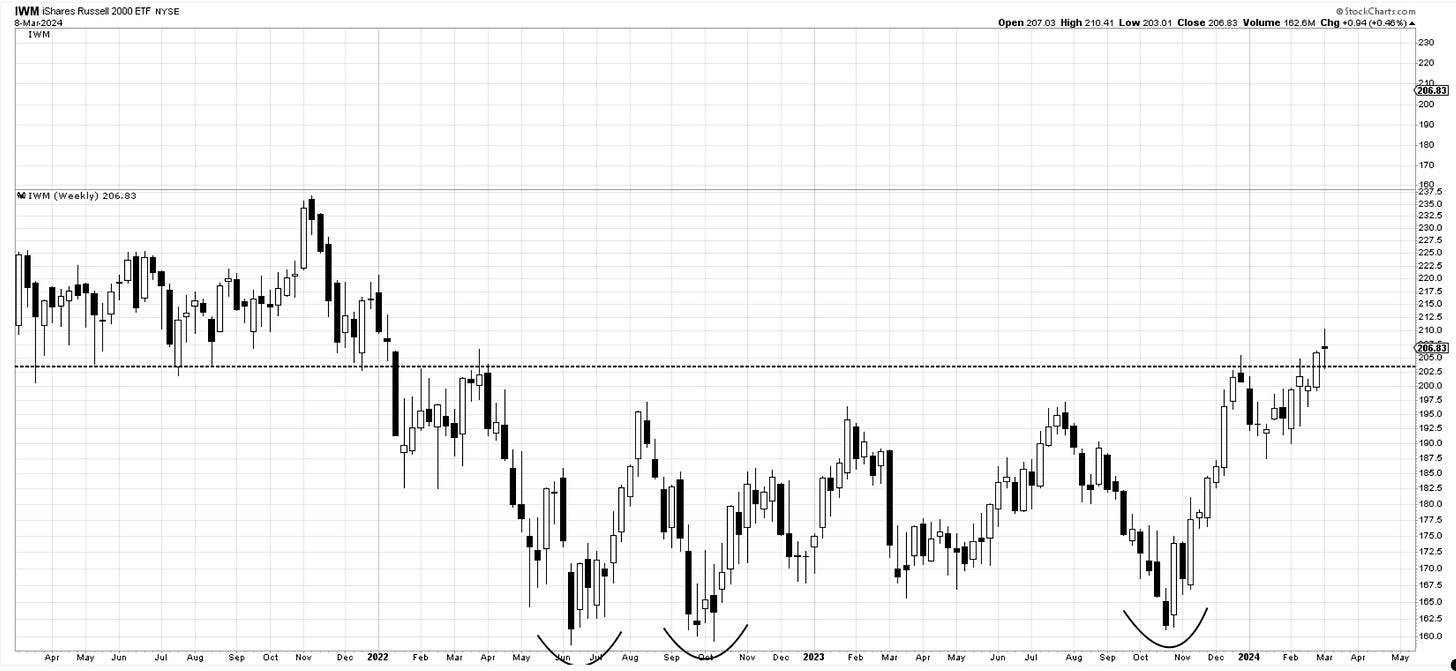 IWM—small caps. This index, which has been severely underperforming, made new 52-week highs. It’s one area of the market that can stage significant returns going forward, especially on a rate-cutting cycle. This week’s close was flat but unless we close back below 200 I would not be terribly concerned. Curious how it will behave if the other markets are taking a breather.