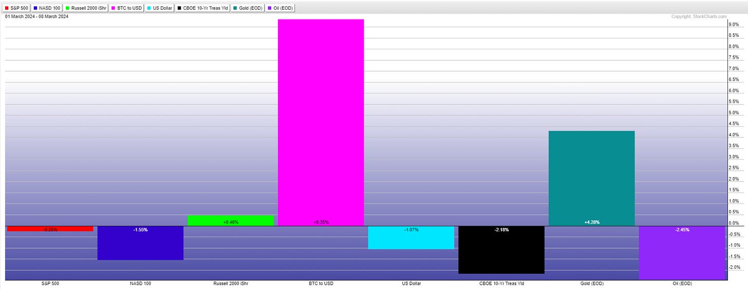 Once again, BTC is the outstanding performer this week, with +9.35%. I mentioned Gold last week on a buy setup, and it performed well as a close second to BTC. Equity markets have retreated and are trying to signal a corrective period is approaching.