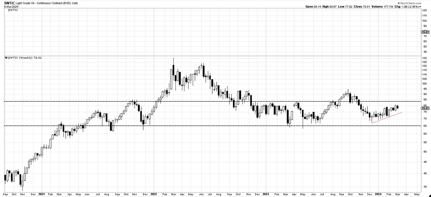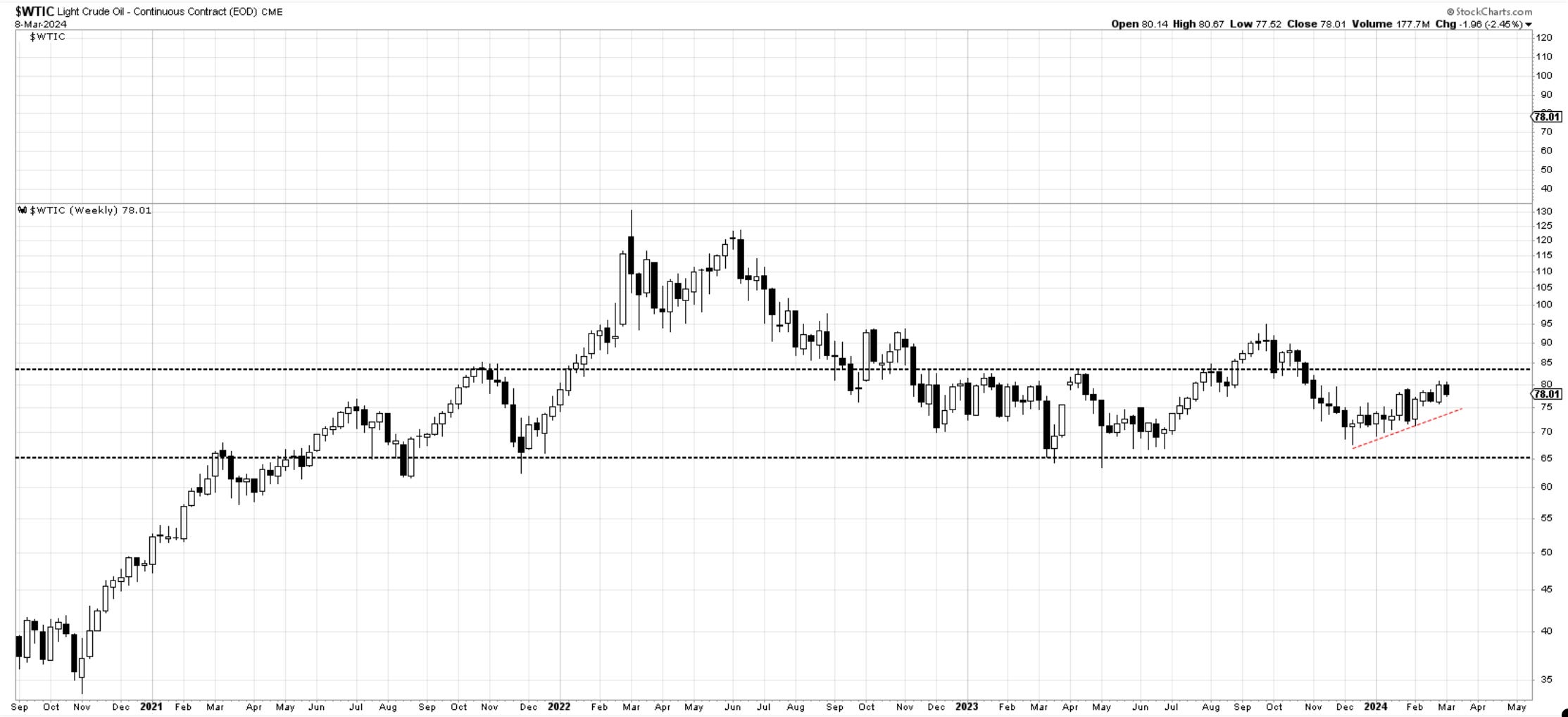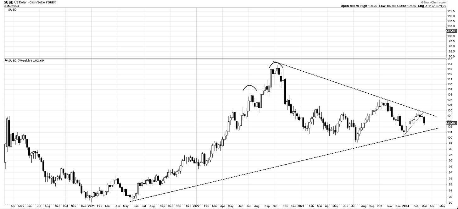 The US Dollar - remains in a state of equilibrium near 104. There are head and shoulder arguments since May 2023 peak with a head Oct 2023. Usually, these formations need to reverse something, and there is nothing apparent to reverse. Looking as a continuation pattern, it would suggest a break lower, but realistically until 101 gives way, there is not much to do here but observe.