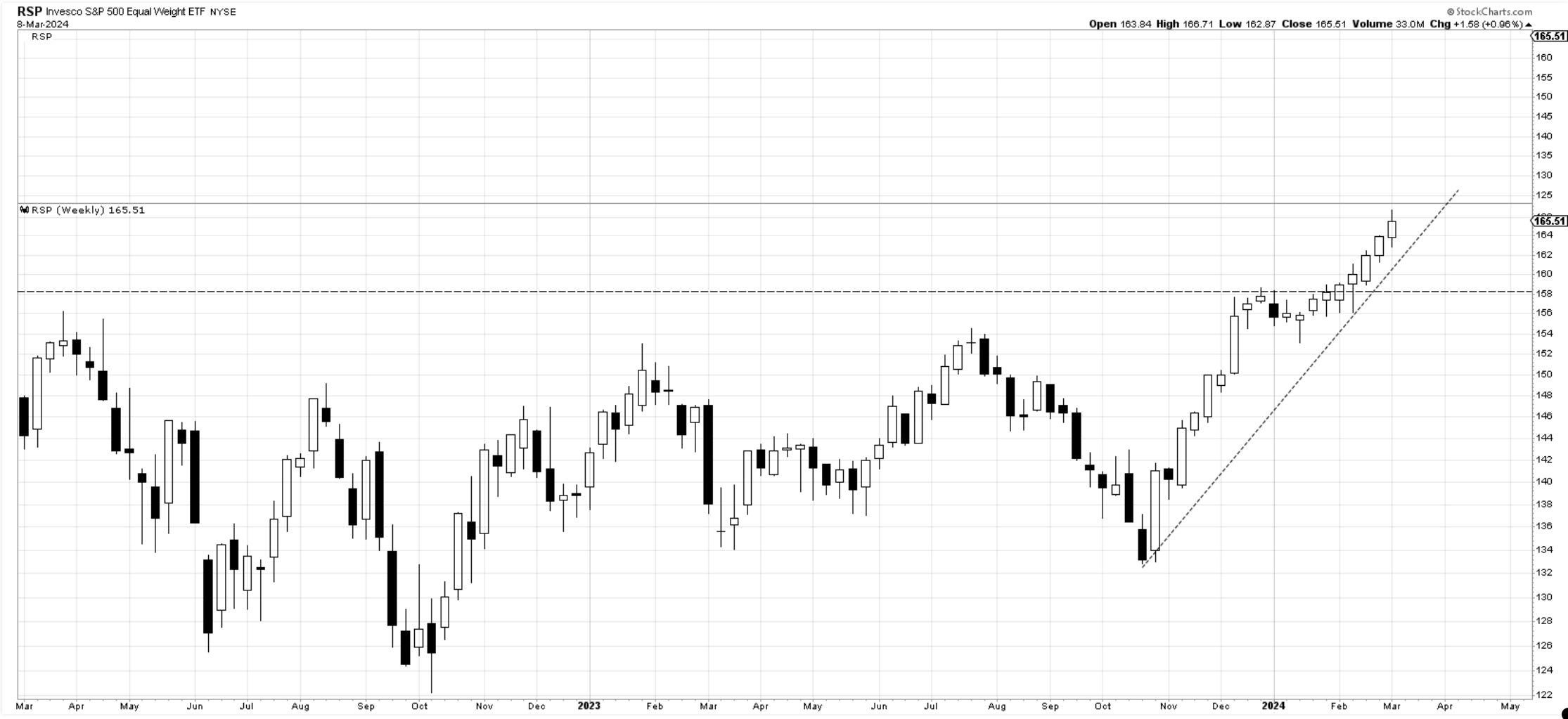 RSP - equal weight SP500. This index shows greater participation from other stocks and exposes the weakness we have seen in large-cap names this week. It's another decent all-time weekly close. For those that play defense this might be a way to do it and still keep exposure to markets.