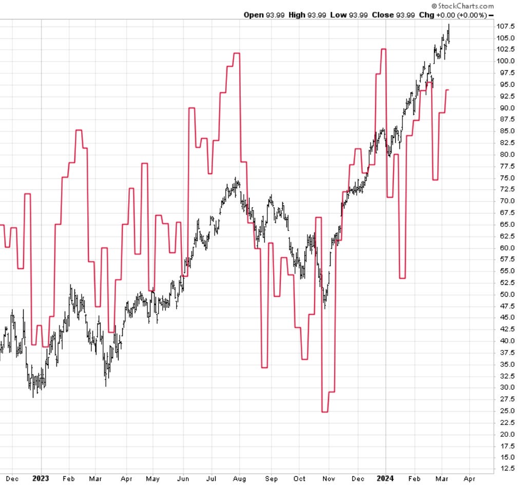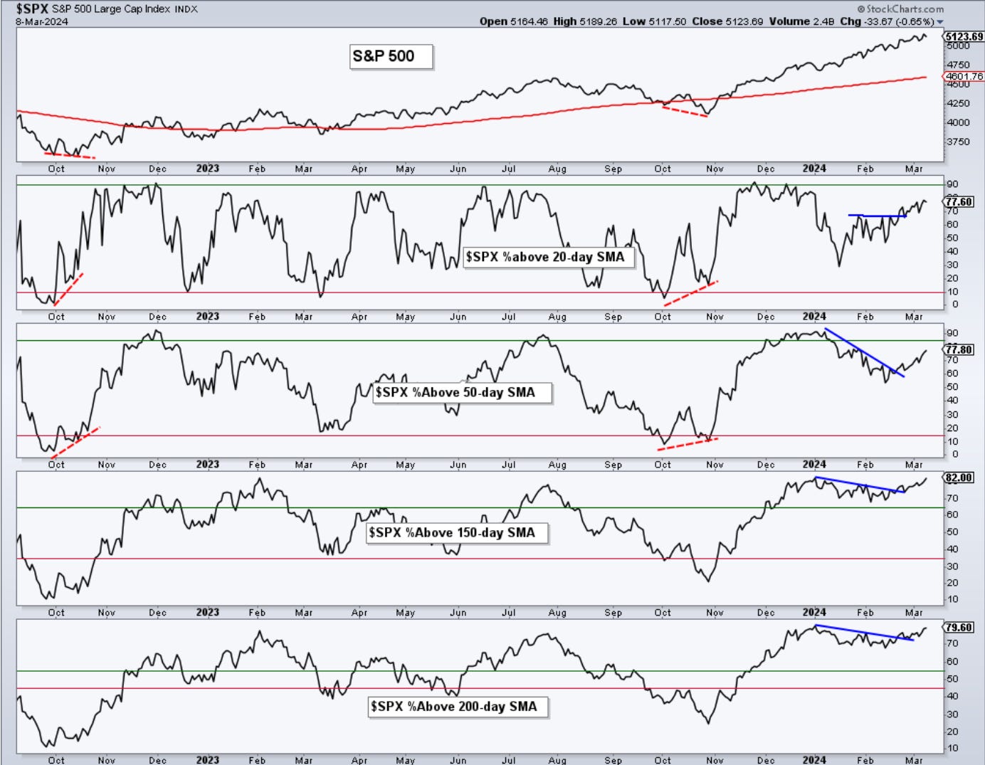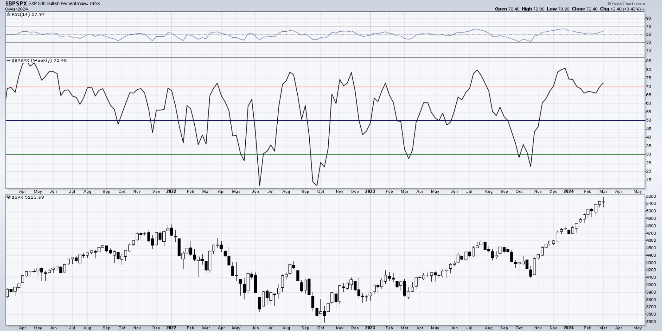 The Bullish Percent Index has increased above 70 this week and remains in bullish territory. It needs to get below 50 to raise larger concerns.