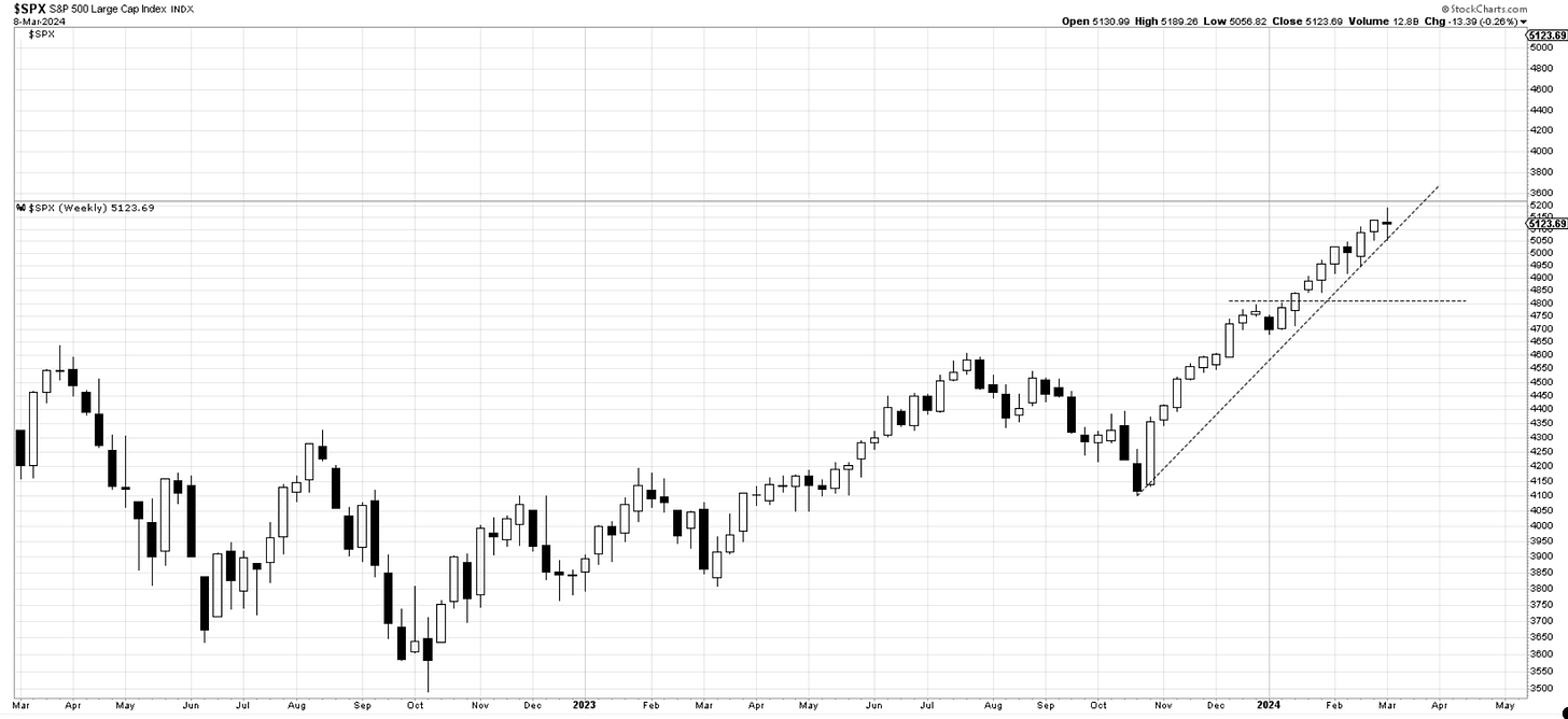 SP500. A new weekly high was made this week, but we have failed to stage another higher close. For further confirmation, let’s watch for a weekly close below the trendline. 5050, once again, is that line in the send.